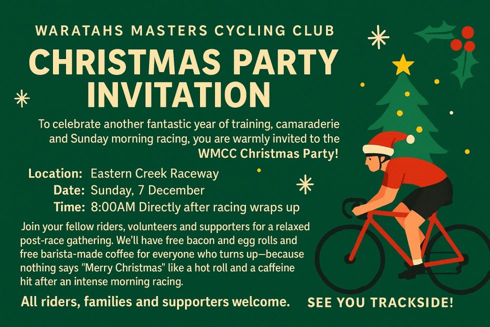 WMCC Xmas Party – Sunday 7 Dec – straight after racing at SMSP (at the same venue) November 16, 2025 Paul King Share This Tweet Share Related Posts Waratahs annoucement – 1st Female – every grade – every race – $50 per Grade Club Championships – Results – 31 Aug 2025 Bib Colours – WMCC Club Championships – Sunday 31 August 2025